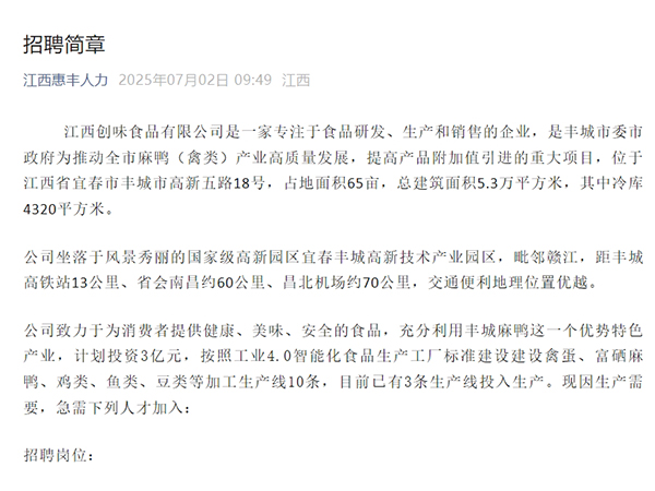 江西創(chuàng)味食品有限公司是一家專注于食品研發(fā)、生產(chǎn)和銷售的企業(yè),是豐城市委市政府為推動(dòng)全市麻鴨(禽類)產(chǎn)業(yè)高質(zhì)量發(fā)展,提高產(chǎn)品附加值引進(jìn)的重大項(xiàng)目,位于江西省宜春市豐城市高新五路18號(hào),占地面積65畝,總建筑面積5.3萬(wàn)平方米,其中冷庫(kù)4320平方米。公司坐落于風(fēng)...